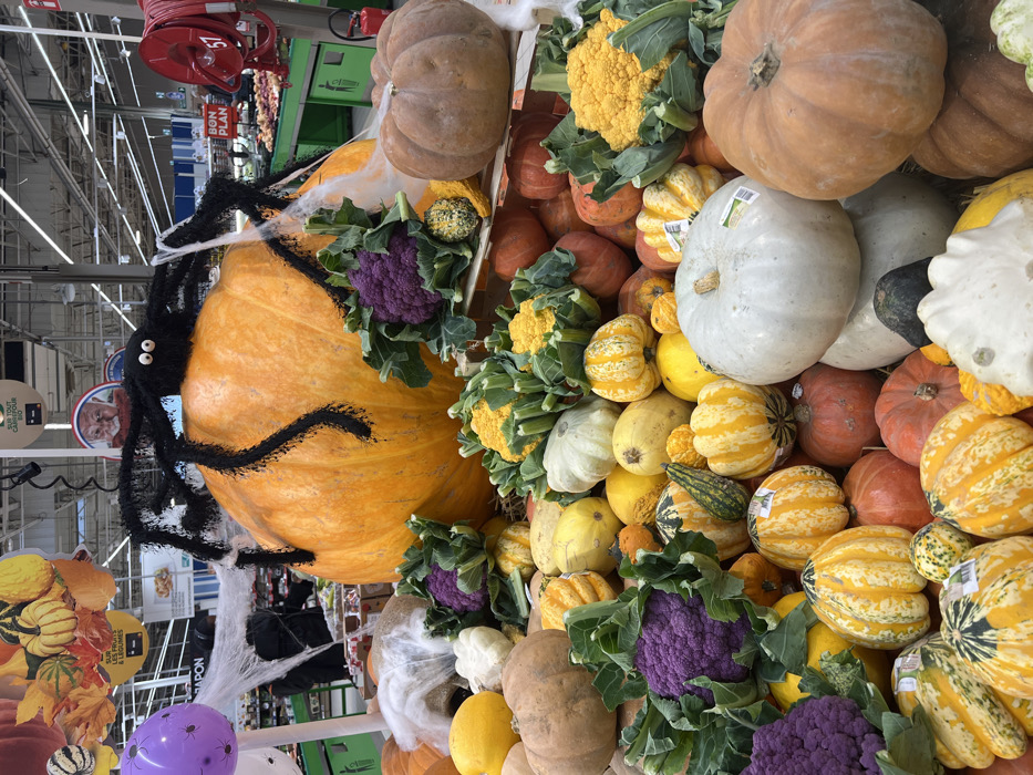 - "This image depicts a large, festive autumn and Halloween-themed produce display inside a Carrefour hypermarket in Hérouville-Saint-Clair, France" by FM-RPGCC2, licensed under CC BY 4.0