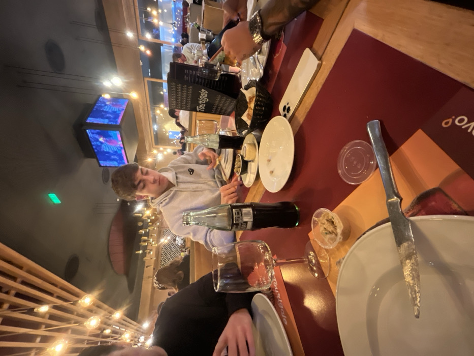 A rotated, tilted overhead shot depicts people at a restaurant table. One person wears a gray hoodie. There is a glass bottle of Coca-Cola, a glass of red liquid, white plates, a knife, and a small container on the table. A black basket, likely containing food, is also present. A smartphone lies on the table. String lights are visible in the background, as well as a television displaying colorful visuals.