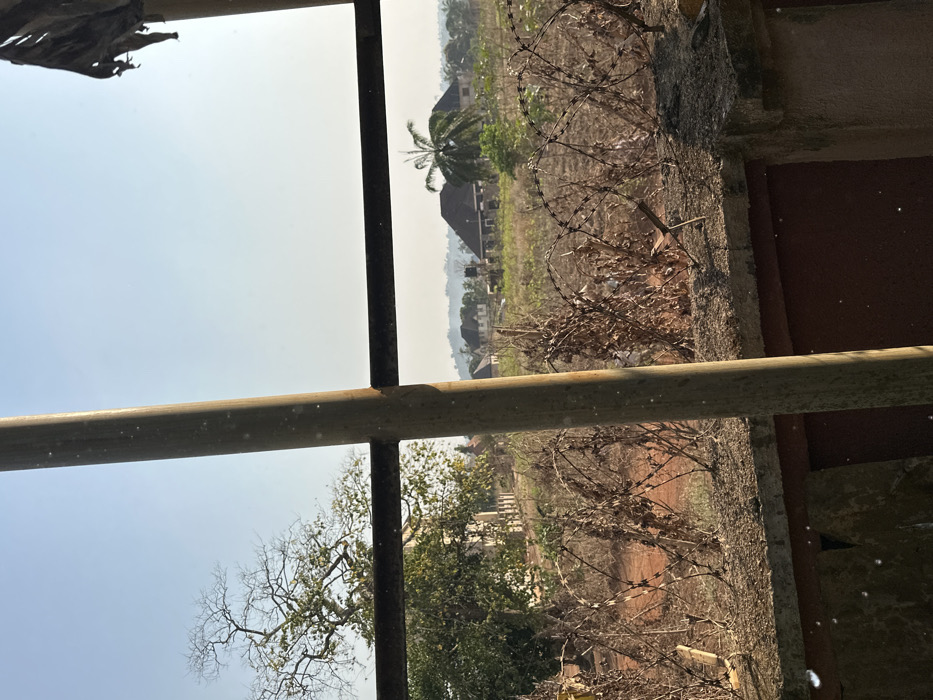 This image depicts an outdoor scene in Agbogugu, Nigeria, characterized by a mix of undeveloped land and residential structures under a hazy daytime sky