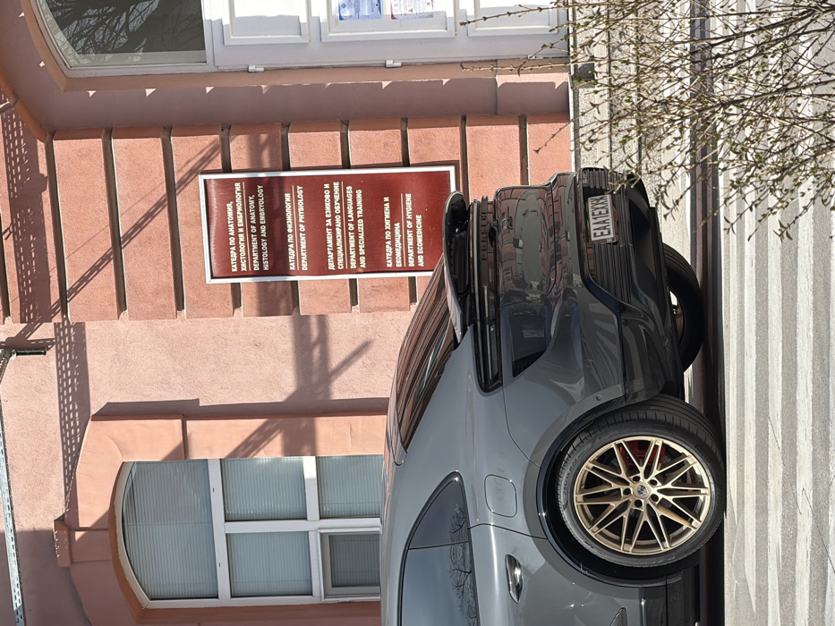 The scene depicts the exterior of a building belonging to the Medical University of Plovdiv, Bulgaria. A dark grey Porsche Macan Turbo, identified by its "Turbo" badging and Bulgarian license plate "EAA 1EXXX", is parked facing away from the viewer, with its rear left side prominently visible. The vehicle features gold-colored multi-spoke wheels with red brake calipers. The building's facade is reddish-pink with horizontal stone-like banding. An arched window with horizontal blinds is visible on the left, and a white-framed entrance or window is on the right. A prominent dark red vertical sign on the facade lists various university departments in both Bulgarian Cyrillic and English, including "Department of Anatomy, Histology and Embryology", "Department of Physiology", "Department of Languages and Specialized Training", and "Department of Hygiene and Ecomedicine". The car is positioned on a paved surface, with white crosswalk stripes partially visible beneath its rear tire. Sparse, leafless bushes occupy the bottom right foreground. Strong sunlight illuminates the scene, casting distinct shadows on the building's facade. No individuals are present.