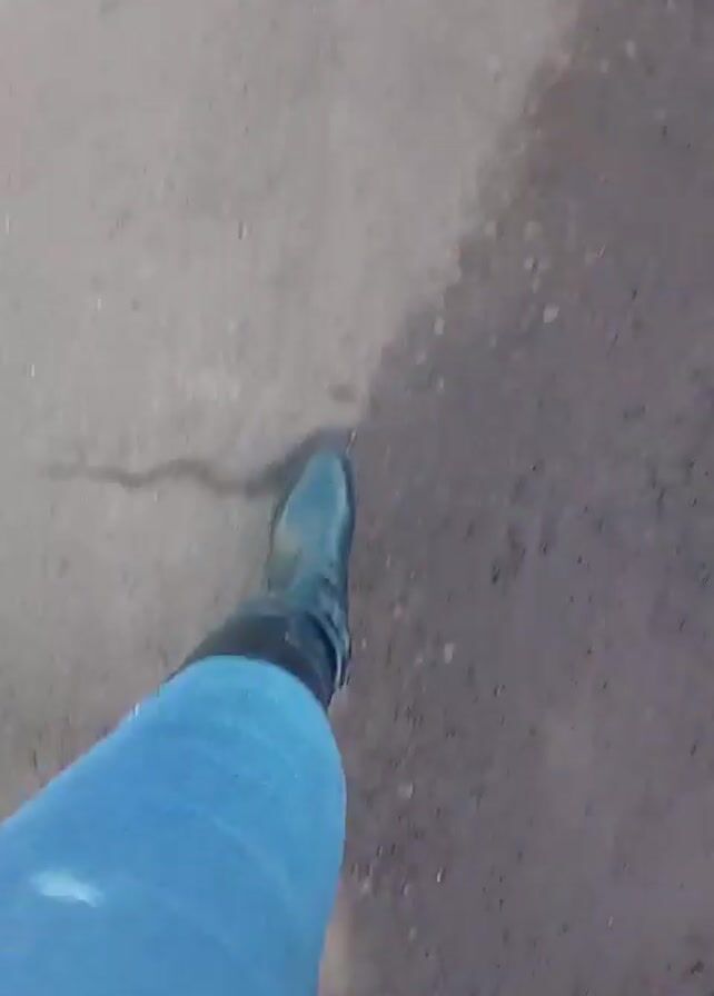 A person wearing blue jeans and shiny, dark-colored knee-high boots walks on a paved surface. The boots and the lower part of the person's legs are visible from a point-of-view perspective, looking down as they walk. The person is holding a white object, possibly a cloth or paper, in their hand. The paved surface appears wet or damp in some areas. The lighting suggests it is daytime, with some shadows visible on the pavement. The focus is primarily on the person's legs and footwear as they move.