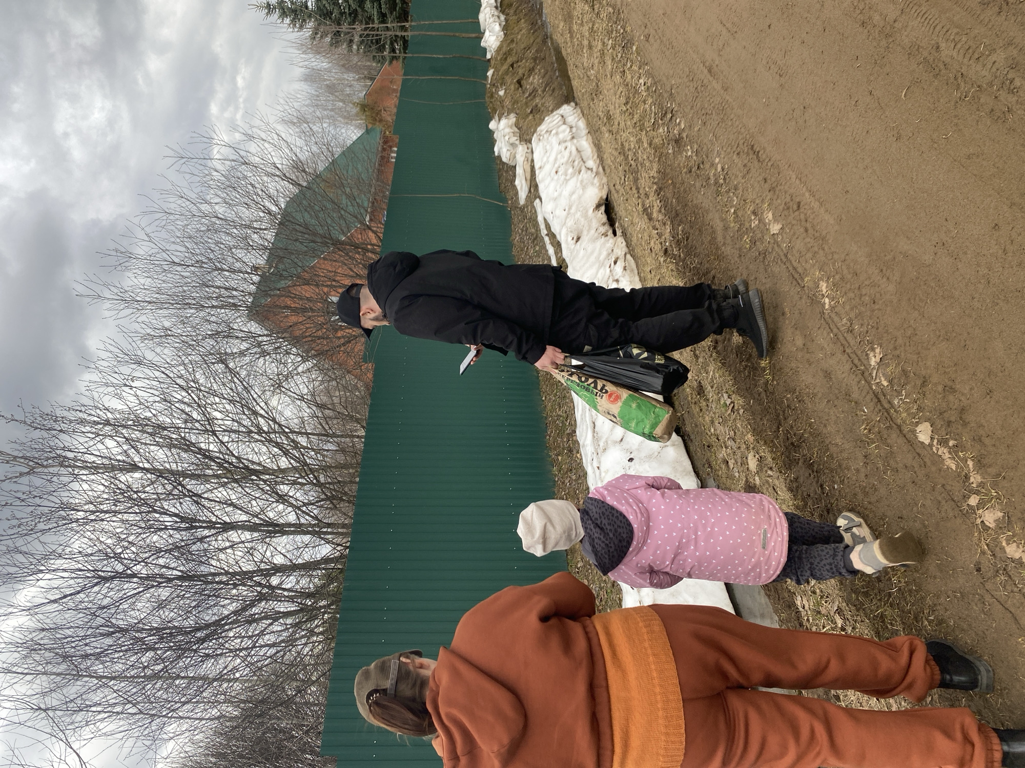 The image depicts a scene in Zhigalki, Russia, along a dirt path beside a green corrugated metal fence with melting snow patches. Three individuals are present. A person in black attire (hoodie, pants, cap) walks along the path, carrying a bag and a mobile phone. Adjacent to them, a child in a pink jacket and gray pants stands near the path's edge. Another person wearing a brown sweater and pants is positioned closest to the viewer. The environment shows bare trees against a cloudy sky.
