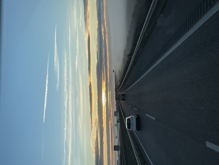 A slightly angled view of a multi-lane highway at sunrise. A white car and a truck are visible, traveling on the road. The sky is a gradient of blue to orange, streaked with long, thin clouds and contrails. Patches of fog are visible along the edge of the highway. The highway's shoulder has guardrails.