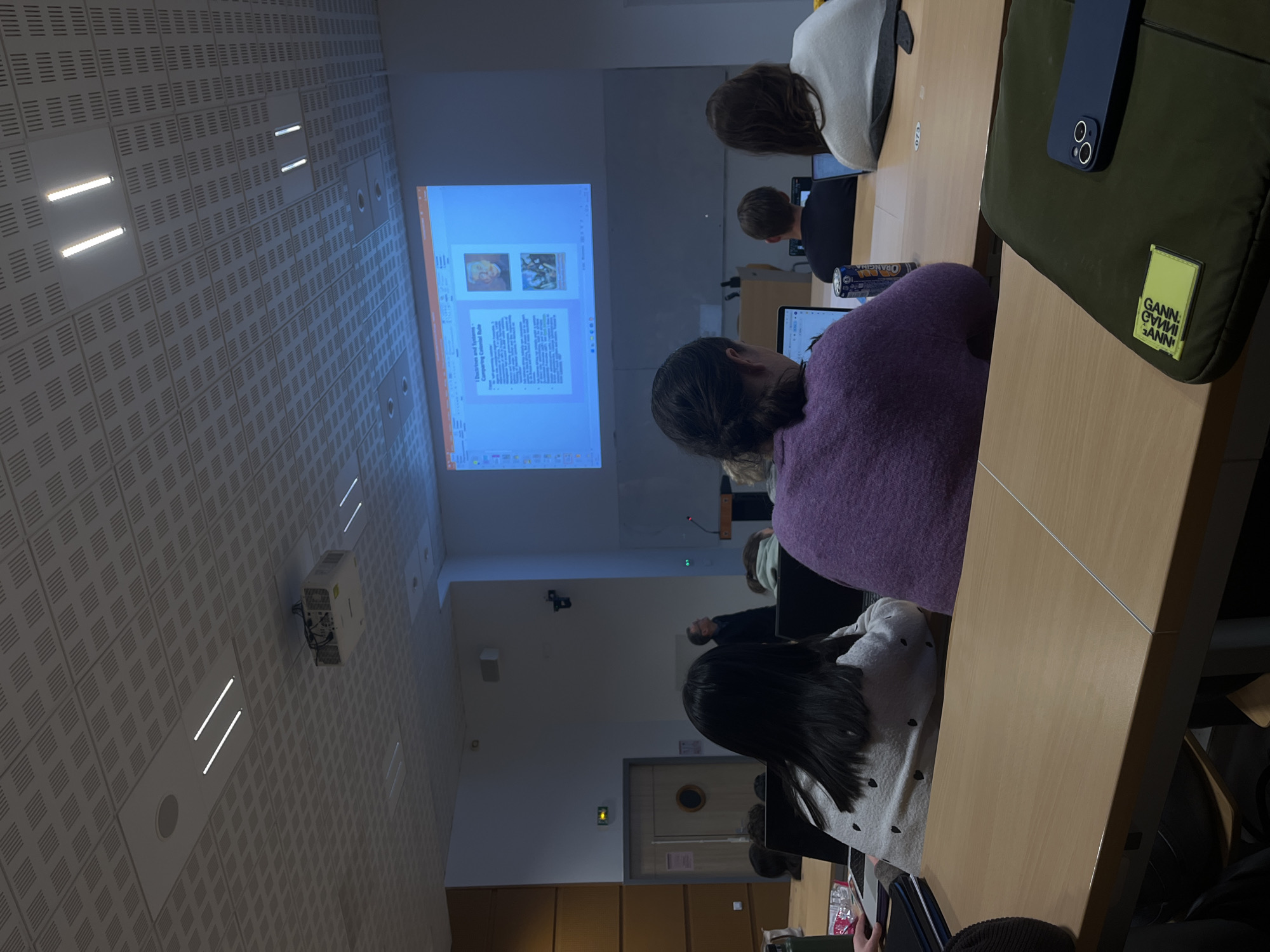 The image depicts a classroom setting, likely in a university or educational institution in Lyon, France. The room is filled with students sitting at desks, focused on a lecture or presentation projected onto a screen at the front. The projector is mounted on the ceiling. The projector screen displays information and images, suggesting a visual presentation is underway. The students are seen in various poses, some with laptops open, indicating they are either taking notes or engaging with the material online. The classroom is well-lit with overhead lights. The desks are arranged in rows, common in a lecture hall setting. A green Ganni brand bag is on the table in the foreground. Based on the details, the scene is an ordinary classroom environment where students are engaged in a learning activity in Lyon, France.