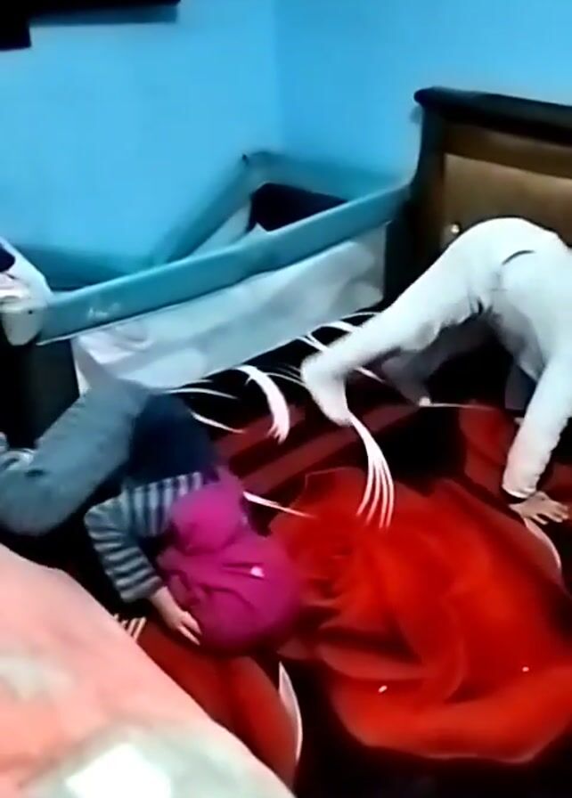 Two children are playing on a bed. The bed has a red floral-patterned bedspread and a dark headboard. One child, dressed in white, initially bends over backward. They then fall back onto the bed. The other child, wearing a striped shirt and a pink hat, seems to be laughing. A blue cot is situated along the side of the bed. The room has blue walls.