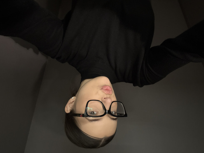 An individual with fair skin, wearing glasses with thick black frames, poses for a selfie from an upside-down angle