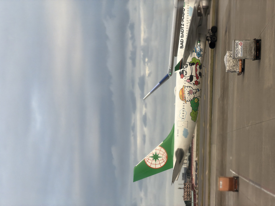 An airplane with a green tail and the words "BAD BADTZ-MARU" painted on its body sits on an airport tarmac. The plane has cartoon characters, including Hello Kitty and a panda, decorating its side. The sky is overcast. Airport infrastructure like baggage carts and buildings in the background.