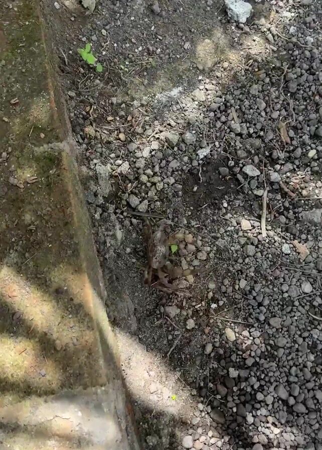 land crab on a gravelly, soil surface next to a brick structure
