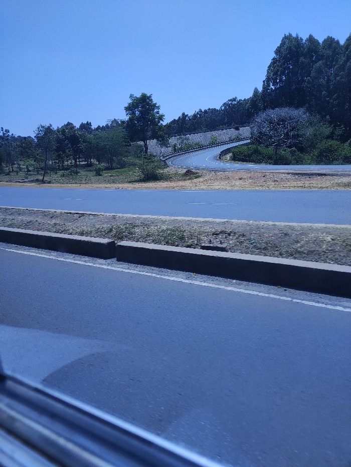 The image displays a daytime outdoor scene of a major highway system in Nairobi, Kenya, observed from within a vehicle. A metallic window trim or door frame is partially visible at the bottom left. The foreground features an asphalt road with a solid white line on its left edge, separated by a concrete curb from a narrow, unpaved median strip. Beyond this median, a wider asphalt thoroughfare is visible. To the right of this thoroughfare is a dry, light brown verge composed of dirt and sparse vegetation. In the midground, a distinct multi-lane asphalt road curves sharply to the right and ascends a gentle slope. This curving road is buttressed by a tall, light-colored retaining wall, constructed from patterned concrete blocks, which follows the curve along the base of a significant hillside. The hillside is densely forested with a variety of trees, predominantly dark green, extending towards the horizon. A prominent tree with a lighter, possibly greyish or bare, canopy stands out on the right, positioned between the curving road and the main thoroughfare. Further left, scattered trees and shrubs occupy lower ground adjacent to the main road. The sky above is clear and bright blue, devoid of clouds. No individuals, other vehicles, or specific actions are discernible in the scene. This infrastructure is consistent with sections of major bypasses or expressways within Nairobi, such as the Nairobi Northern Bypass, traversing hilly terrain.