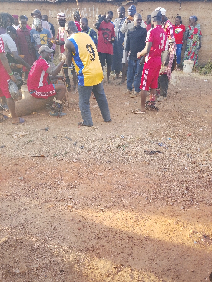 A group of people gather outdoors. One person, wearing a red jersey, sits on a wooden block with chains around their ankles, holding hands with a person in a yellow jersey. Other individuals stand around, some holding bowls or other items. The background shows a wall with some graffiti or markings. The ground is dirt.