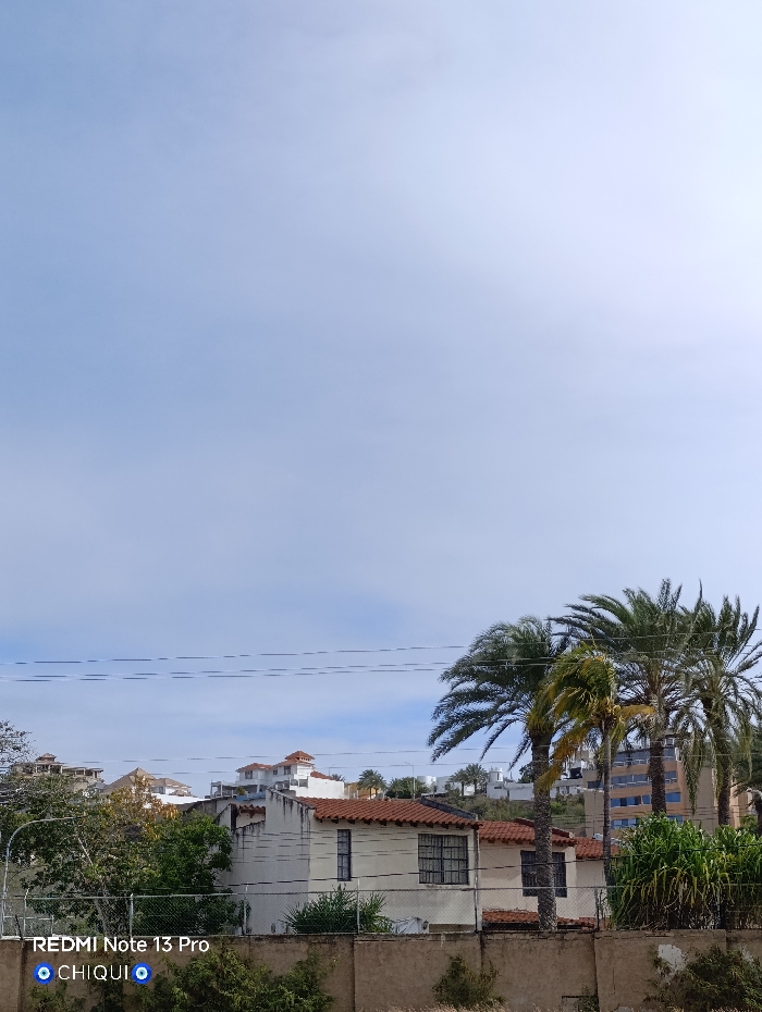 The image presents a static, elevated view of an urban/suburban landscape in Pampatar, Venezuela, under a pale blue to white overcast sky that occupies the upper two-thirds of the frame. The foreground features a horizontal, textured brownish-grey concrete or stucco wall. Immediately behind this wall, a chain-link fence topped with security wire is partially visible, interspersed with various green shrubs and foliage. In the midground, several residential structures are observed, characterized by light-colored, likely white or cream-colored, stucco walls and reddish-brown terracotta tile roofs. One prominent house on the left displays dark-framed windows fitted with security grilles. Multiple palm trees of varying heights and frond densities are scattered throughout the midground, with a dense cluster positioned on the right side. Three parallel dark utility wires or communication lines extend horizontally across the upper-mid portion of the left frame. The background consists of a gentle hillside populated by additional buildings. Some structures resemble the residential architecture seen in the midground, while others appear as taller, multi-story buildings, possibly apartment complexes, with lighter-toned facades, particularly on the right. Sparse vegetation is visible on the ascending terrain. No human figures, animals, or active interactions are present in the scene. A digital watermark displaying "REDMI Note 13 Pro" and "CHIOUI" accompanied by two blue evil eye symbols is overlaid in the bottom left corner.