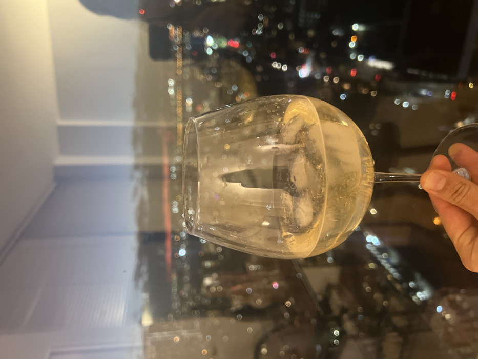 - "The image presents a close-up, high-angle perspective from indoors, featuring a hand holding a wine glass against a blurred urban nighttime panorama" by FM-nkyur2, licensed under CC BY 4.0