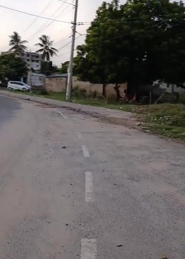 paved road bordered by a curb and sidewalk. There are power lines and utility poles along the side of the road. Adjacent to the sidewalk is a grassy area with a few trees and some buildings. A small group of people can be seen in the shade of the trees. The sky is overcast. The video appears to be taken from a moving vehicle.
