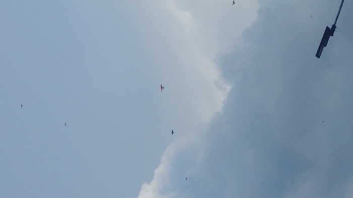 The image depicts a daytime sky scene over an unspecified outdoor location within the city of Unknown, Unknown. The sky is dominated by a mixture of light blue patches and significant formations of white and grey cumulus clouds. Multiple small aircraft are visible at various altitudes across the frame. A distinct red, T-shaped ultralight aircraft or powered paraglider is centrally located in the upper-middle section. At least seven additional smaller, dark-colored flying objects, appearing as specks or faint cross-shapes, are scattered throughout the frame, consistent with drones or remote-controlled aircraft. In the bottom right corner, a portion of a dark grey modern LED street light fixture is partially visible, angled diagonally upwards to the left. No individuals are present. The scene indicates aerial activity occurring under partly cloudy conditions.