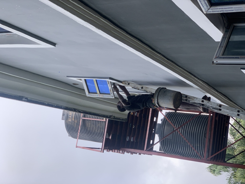 The scene, located in Amaeshi, Nigeria, shows an outdoor view of a grey-painted building facade under an overcast sky. A dark-skinned male, wearing a dark t-shirt and dark trousers, stands on a silver metal ladder. He is positioned against the building at the level of a second-story window, which has a white frame and a blue-tinted pane, and is actively working on its exterior frame with both hands. A grey metal bucket is suspended from the ladder below his right foot. To the left of the building, a red metal scaffolding structure supports two large, ribbed, black plastic water tanks; the upper tank bears a partial "HART Industrial Ltd" label. Green foliage is visible in the lower-left background, and a partially open window with "aluminium global aluminium profe" visible on its frame is present in the lower right foreground.