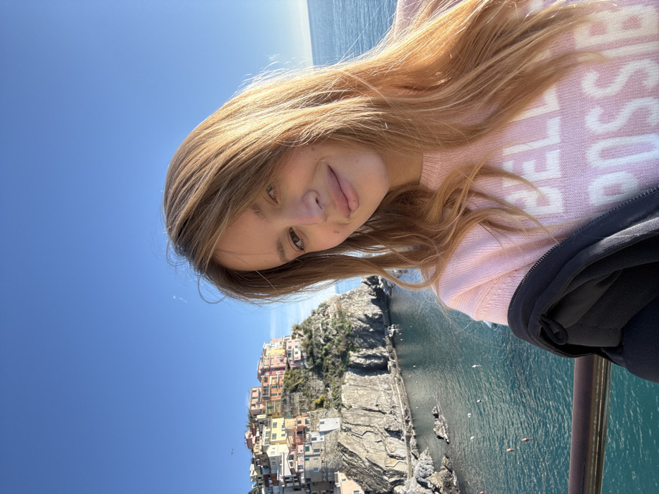 A young female is depicted in a close-up, front-facing photograph, positioned outdoors in Manarola, Italy, overlooking its harbor