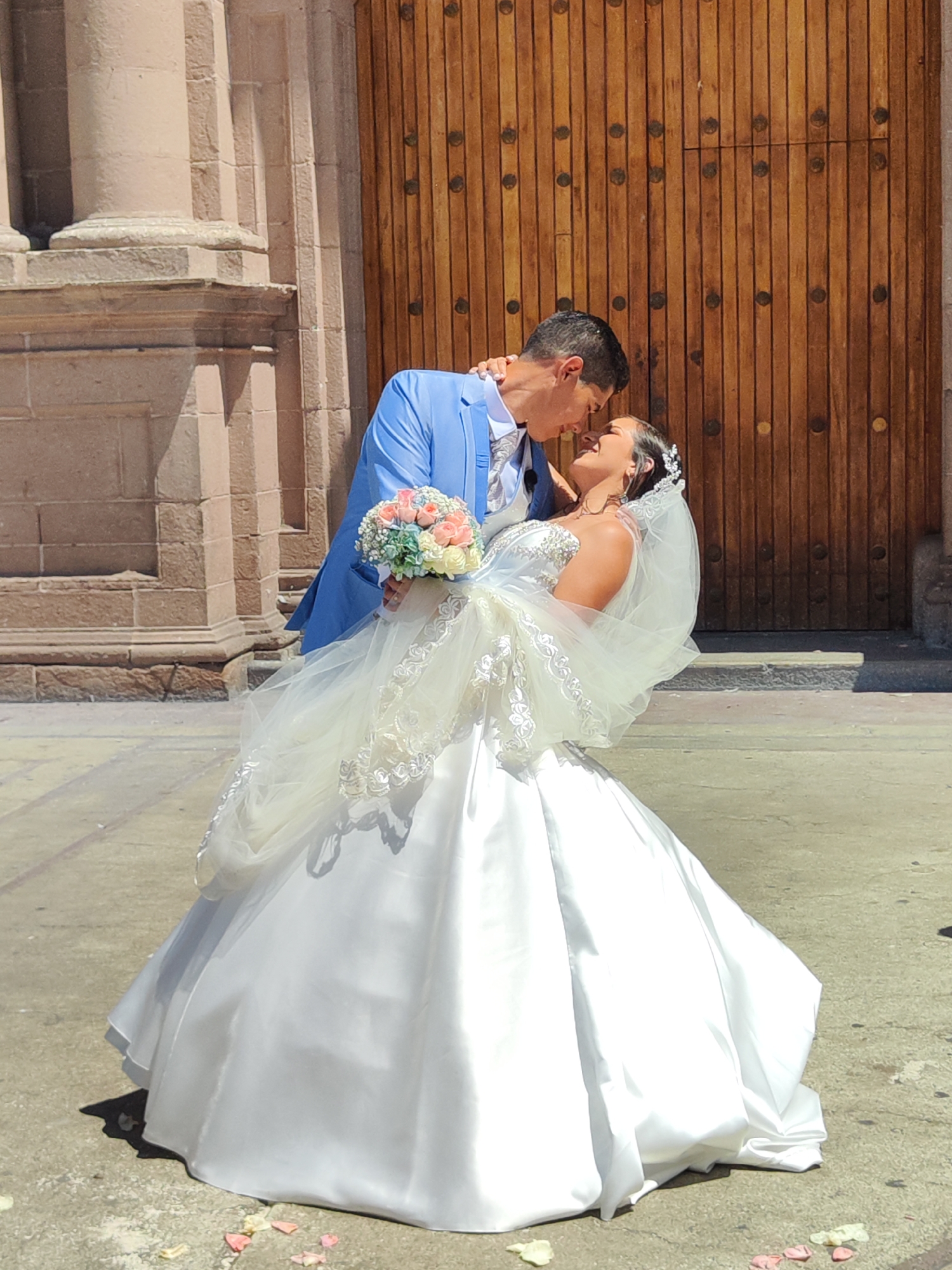 A newlywed couple is embracing outside a building in Tacna, Peru. The groom, in a light blue suit, holds the bride in a white satin gown. She is carrying a bouquet of light-colored flowers. The building behind them is a stone structure with a large wooden door. Petals are scattered on the ground around the bride's dress.