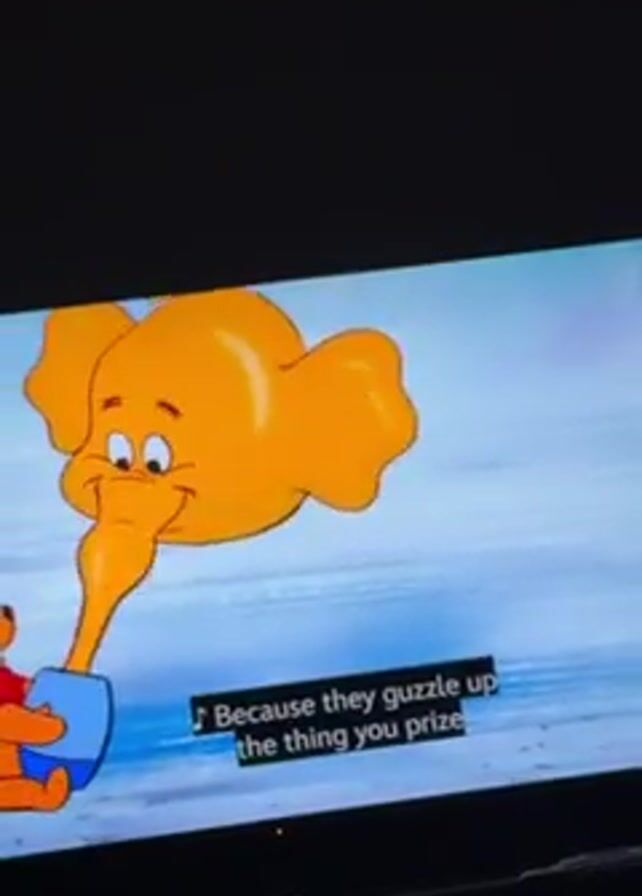 A television displays a scene from a Winnie the Pooh animation. The first image shows Winnie the Pooh seated, holding a blue honey pot, as an orange Heffalump drinks the honey from it. The Heffalump's body fills with honey as it drinks. The second image shows a pink Heffalump wearing a bow and a red Roo dancing with a red jump rope. Lyrics for a song are superimposed on the screen.