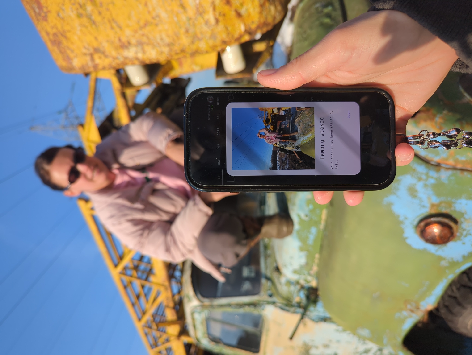 The image depicts an outdoor scene in Khimki, Russia, under a clear blue sky. In the foreground, a light-skinned right hand, wearing a dark long-sleeved garment, holds a black smartphone vertically. A metallic keychain featuring multiple silver-colored, oblong, linked elements hangs from the bottom of the phone. The phone's screen displays an application interface with visible tabs ("MY", "NEU", "TOP", "CORE", "PPL", "NEAR", "LIVE") and a username "Marina_Kore". The central content on the screen is a rectangular image of a person, matching the individual in the background, standing on a vehicle and making a peace sign gesture. Below this image, a white box with black text reads: "Memory staked / Your memory has been staked by Akib. / Open". In the mid-ground, a blurred individual, likely female, with dark hair pulled back and wearing dark sunglasses, a light pink puffer jacket, and dark pants/boots, is observed crouching or squatting on the front of a heavily weathered and rusted truck. This individual is looking towards the camera with a slight smile. The truck's body exhibits significant paint deterioration, with visible patches of faded green, light blue, and extensive rust. A single, rusted, orange-tinted headlight is visible on the truck's front. The background includes a large, yellow, weathered metallic structure, appearing to be part of an industrial crane or framework. In the distant background, against the clear blue sky, electrical power lines and a pylon structure are faintly discernible. The overall environment is an outdoor, industrial, or abandoned area.