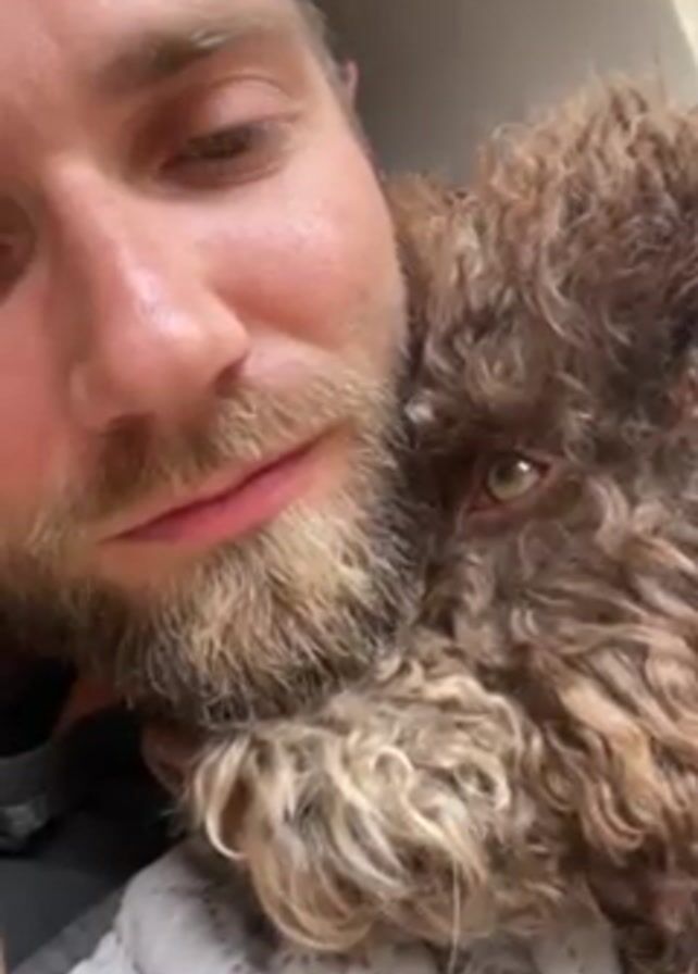 A close-up shot depicts a man and a brown, curly-haired dog snuggled together