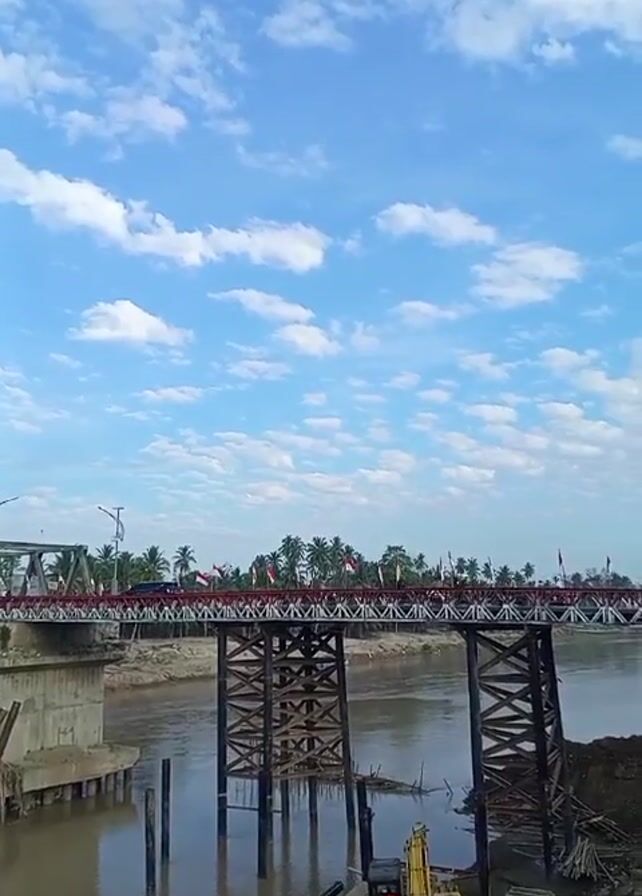 river with a metal bridge spanning it. The bridge is decorated with red and white flags, and several people are walking across it. The river banks are muddy, and a yellow excavator is visible on a platform near the water. The sky is blue with scattered white clouds.