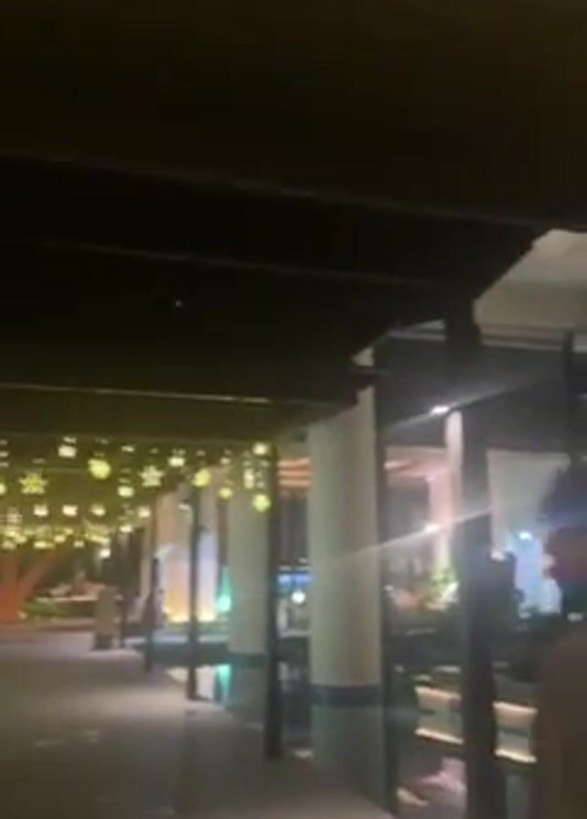 n outdoor area at night. Initially, the focus is on an overhead structure adorned with string lights, leading into a dimly lit walkway. As the camera moves forward, a person with dark hair walks into view, their back facing the camera. The scene opens up to reveal a serene water feature reflecting the warm glow of a multi-story building in the background. The building appears to have an open-air dining area with tables and chairs visible, with people moving around inside.