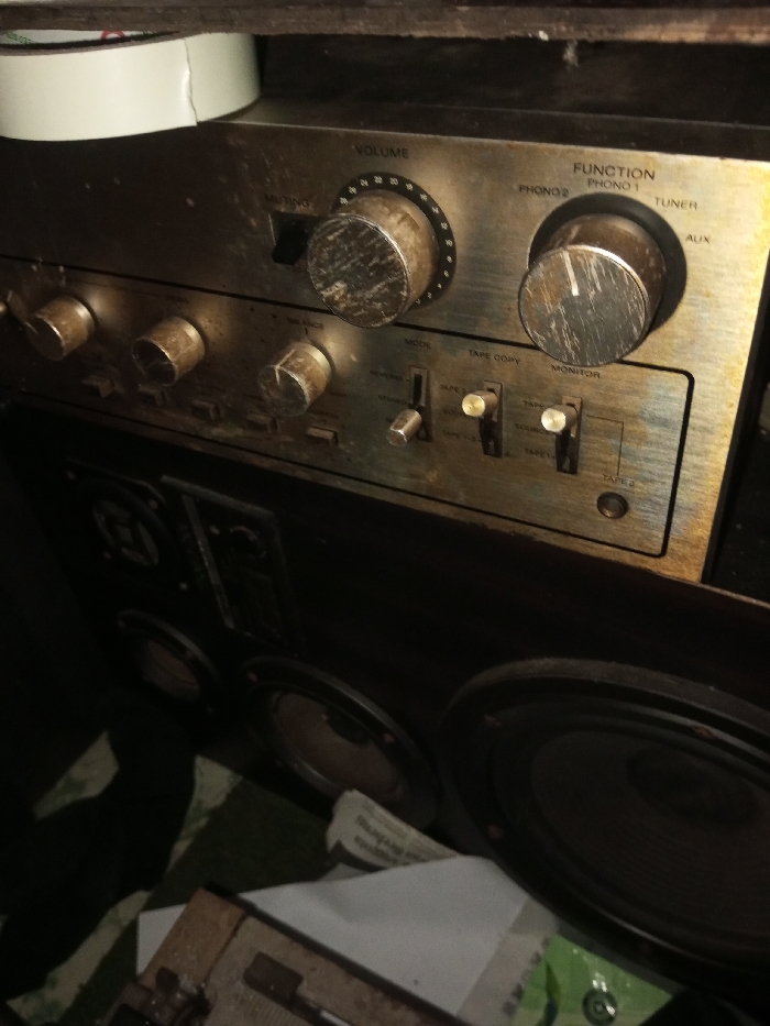 dusty, vintage audio amplifier and speaker system. The amplifier's front panel features knobs for volume and function selection (phono, tuner, aux), as well as switches for mode, tape copy, and monitor. A series of smaller knobs sits below the larger ones. The speaker cabinet is positioned beneath the amplifier. Both units appear to be aged and in need of cleaning.