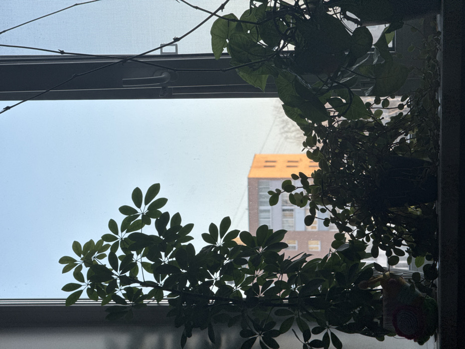 A static, forensic view captured through an interior window in Kladovitsy, Russia, depicting a domestic window sill in the foreground and an urban landscape in the background under clear daylight. The foreground presents a window sill, occupied by multiple potted houseplants and a decorative item. From left to right: A large, dark green Schefflera plant with palmate leaves stands prominently, silhouetted against the bright window, its foliage extending upwards and across the left portion of the frame. To its right, a smaller potted plant with numerous trailing, roundish leaves, also in silhouette, occupies the central portion of the sill. On the far left of the sill, a crocheted or stuffed figurine resembling a snail, featuring a pink spiral shell and a light green body, is positioned. To the right, another leafy plant, possibly a climber or a large trailing species, is partially visible, obscuring the right-hand window frame. The window itself is framed by a vertical, light-colored (likely white or grey) mullion in the middle-right, complete with a matching handle. The background, visible through the window, reveals an urban setting under a clear, pale blue sky. A multi-story apartment building with light-colored facades and rectangular windows is partially visible behind the central and left plants. To the right of this building, another section or a distinct building with an orange/terracotta colored facade and vertical recessed panels or structural elements is prominently illuminated by sunlight. Faint outlines of bare trees or branches are discernible against the sky in the distant background. Power lines or similar cables are faintly visible stretching across the upper right portion of the sky. No individuals are present in the scene. The overall lighting suggests a sunny day, with indoor elements largely in silhouette against the brighter exterior.
