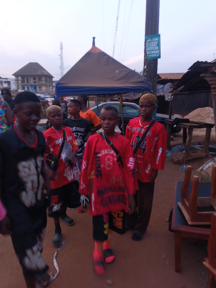 A group of young boys dressed in oversized, colorful clothing walk down a dirt road in an urban area. Most of them are wearing red shirts with various designs and text. The boy in the front-left wears black. There's a market stall with a brown and blue canopy visible behind them. A building, power lines, a street sign, and a pile of sand are visible in the background.