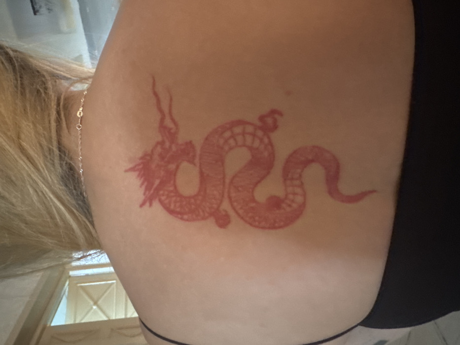 The image displays the upper back of an individual, observed from a rear perspective. The person has blonde hair, visible at the top of the frame. A thin, light-colored chain necklace with small, geometric links is present around the neck. A black garment, possibly a strap top or bra, covers the lower portion of the visible back, with a thin strap extending over the left shoulder. Dominating the center of the upper back is a large, stylized tattoo of a dragon, rendered entirely in red ink. The dragon is depicted in an elongated, coiled posture, facing towards the viewer's left. Its head, featuring a spiked crest and discernible eye, is positioned towards the left shoulder blade. Two wavy lines, indicative of fire or smoke, emanate from its mouth. The dragon's body is intricately detailed with scales, forming a series of S-curves down the spine. In the background, visible over the person's left shoulder (viewer's right), is a partially open, light-colored wooden double door, suggesting an indoor environment. No discernible features within the image allow for the identification of the specific city of Velebi, Georgia.