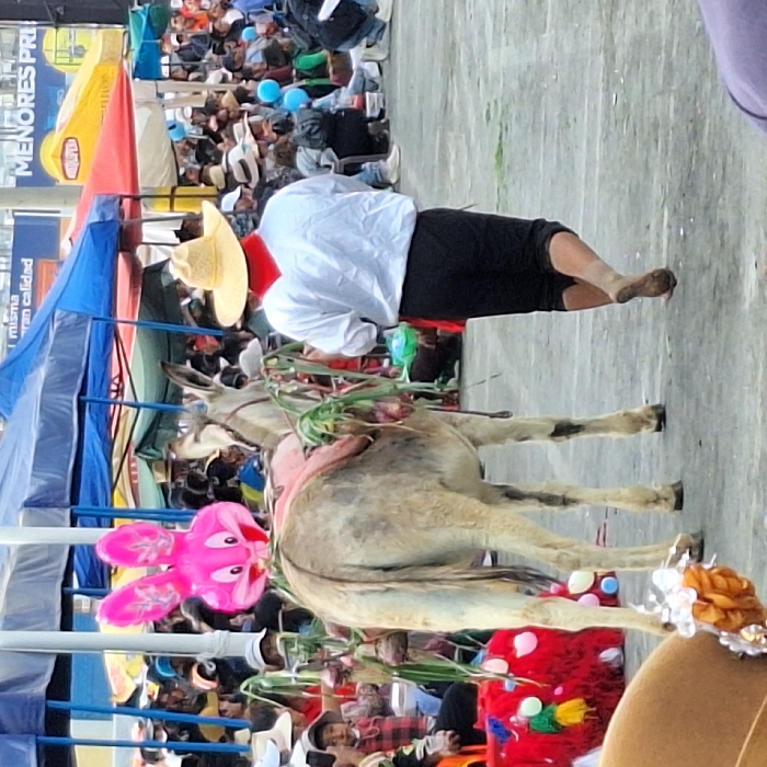 The image depicts an outdoor event in José Luis Bustamante y Rivero, Peru. In the foreground, a light-colored donkey, facing away from the camera, is central, adorned with a pink saddle pad, green garlands, and a large pink inflatable bunny head balloon attached to its back. To the donkey's right, a person walks barefoot, seen from behind, wearing a white long-sleeved shirt, a red neck scarf, and dark-colored cropped pants. The ground is a light grey, possibly concrete or packed earth. The background features a dense crowd of spectators, many wearing hats, and several colorful market-style tents (blue, red, yellow). Portions of buildings and large signs are visible behind the tents, with discernible text including "misma," "gran calidad," and "MENORES PRE."
