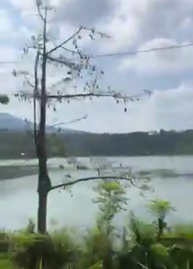 The video depicts a view from a moving vehicle, driving along a shoreline. The body of water is visible through the trees. A couple of structures resembling elevated huts are visible on the shoreline. The weather appears to be partly cloudy.