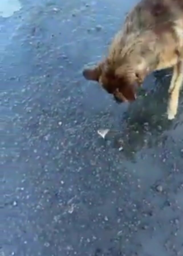 medium-sized, wet dog with tan, brown, and black speckled fur on a wet, dark asphalt surface with some ice or snow to the side. The dog looks up, then moves to eat a piece of food thrown to it.