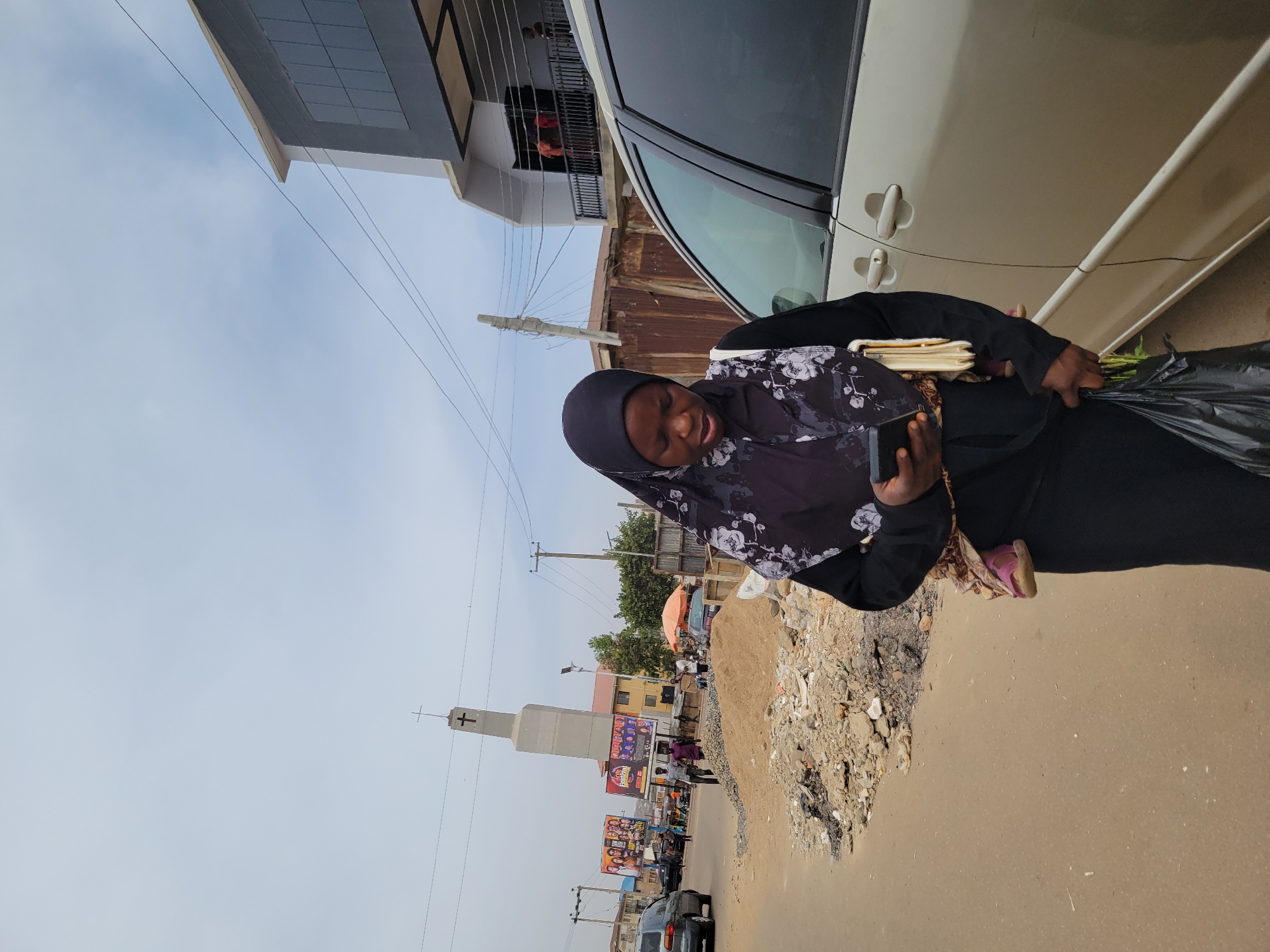 An adult female, dressed in a black hijab with a white and black floral pattern and a black garment, is captured in a daylight street scene in Jos, Nigeria. She is looking down at a black smartphone held with both hands, while a white shoulder bag rests on her left shoulder. In her right hand, she carries a black plastic bag. A pink child's sandal is visible, attached to a patterned fabric sling, indicating she is carrying a child, likely on her back. She is positioned on the edge of a light-colored asphalt road. To her immediate right, a light gold-colored sedan is either parked or moving slowly. To her left, a pile of sand, rocks, and debris lines the roadside. In the mid-ground, a tall, light-colored church steeple with a brown cross at its apex is a prominent landmark. Behind the steeple are two large billboards displaying advertisements, one for an event featuring multiple individuals and text, the other including the word "Festival." Numerous pedestrians are visible along the street, and various vehicles, including a dark grey SUV, are present. The background features a mix of single and multi-story buildings, including a modern-style structure with dark grey paneling and a balcony on the far right. Utility poles and overhead power lines crisscross the frame against an overcast, light grey sky. An orange market umbrella suggests commercial activity further down the street.