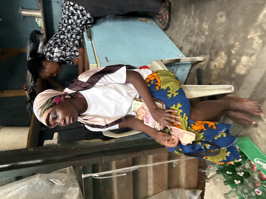 The image depicts an indoor scene in Ajah, Nigeria, likely within a small shop or dwelling