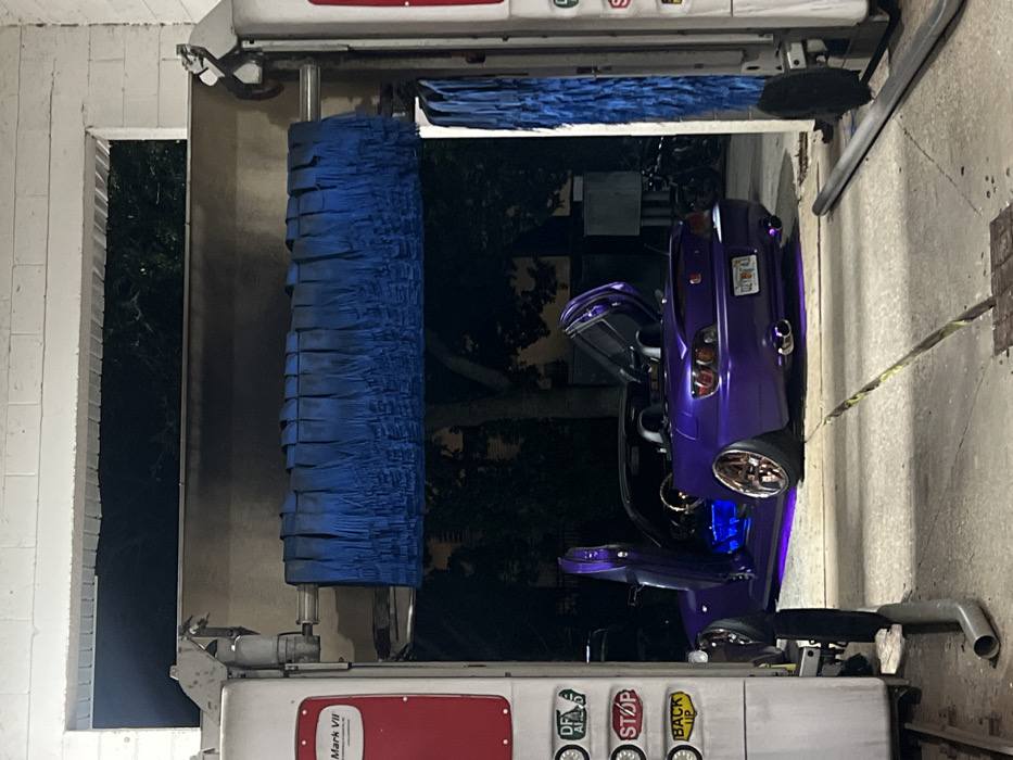 A purple convertible car sits in a car wash. The vehicle is positioned next to a blue cleaning brush. The car's doors are open. In the background, greenery is visible through the car wash structure. Control panels with labels such as "STOP" and "BACK UP" are visible on the machine. A yellow caution tape lies on the car.