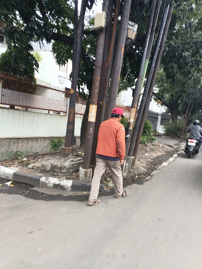 A man in a red baseball cap and an orange jacket is walking along a street, past a cluster of utility poles. He wears beige pants and sandals. A motorcycle passes in the background. A sidewalk with overgrown foliage runs alongside a fence. A light-colored building is visible behind the fence and trees. The road surface is wet.
