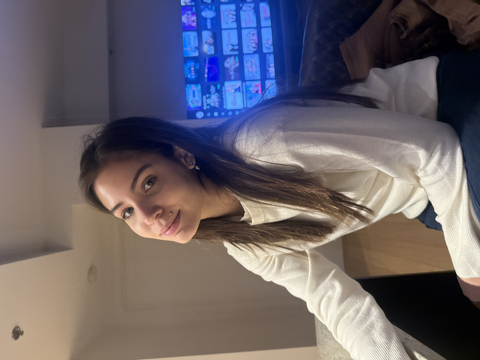 A young woman with dark hair and a fair complexion sits in front of a television displaying numerous movie or show thumbnails. She wears a cream-colored, long-sleeved top and dark pants. Her head is slightly tilted, and she has a subtle smile. The background includes a wall, a glimpse of a patterned sofa, and general indoor lighting.