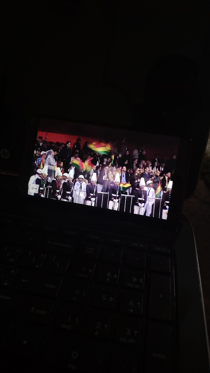 A laptop with a keyboard visible in the foreground displays a photograph on its screen. The photo on the screen features a large group of people, including uniformed individuals and spectators holding flags. The background appears to be a public event or ceremony with a red backdrop. The keyboard and the surroundings are dark, with only the screen illuminating the scene. The HP logo is visible on the laptop, suggesting the brand.