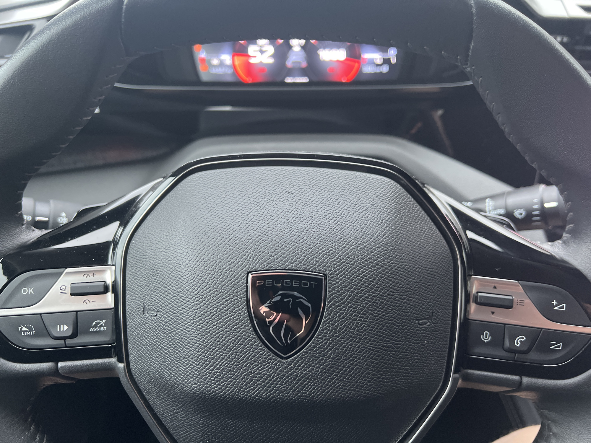 interior of a Peugeot car. The steering wheel is in focus, displaying the Peugeot logo in the center. Various buttons and controls are visible on the left and right sides of the steering wheel. Behind the steering wheel, the car's digital dashboard displays a speed of 52. The location of the photo is not determinable from the image.