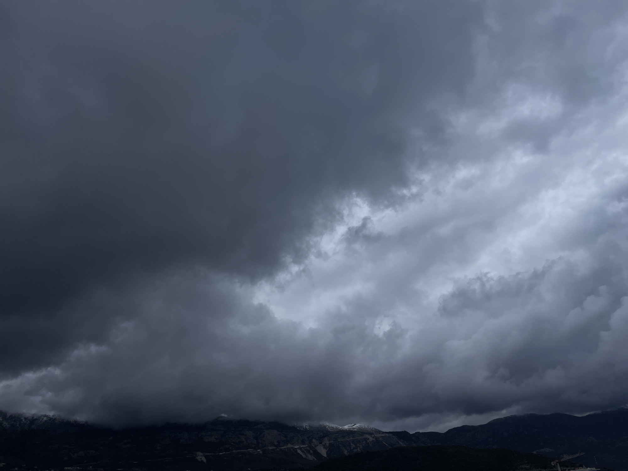- "The image displays an expansive outdoor landscape featuring an heavily overcast sky above a mountain range, observed from within or near Budva, Montenegro" by FM-UjYe32, licensed under CC BY 4.0