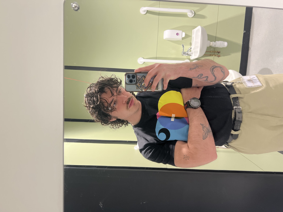 A male individual is depicted in a mirror selfie within a public restroom in the city of Unknown, Unknown. The subject has dark, curly hair and a mustache, appearing to be in his 20s or 30s. He wears a black t-shirt with a colorful graphic design featuring blue, orange, yellow, and red geometric shapes, light-colored khaki trousers, and a black belt. A dark smartwatch is visible on his left wrist, and a clear ID badge is clipped to his right belt loop. Tattoos include a butterfly on his left forearm and an abstract or tribal design on his right forearm. He holds a dark-cased smartphone in his right hand, positioned to capture his reflection. His left arm is crossed over his chest, resting on his right forearm, and his gaze is directed downwards. The background, reflected in the mirror, shows pale green and black restroom stall partitions. To the right, a white wall-mounted sink with a chrome faucet, a white wall-mounted soap dispenser, and two white grab bars are visible. The floor is a light, neutral color.