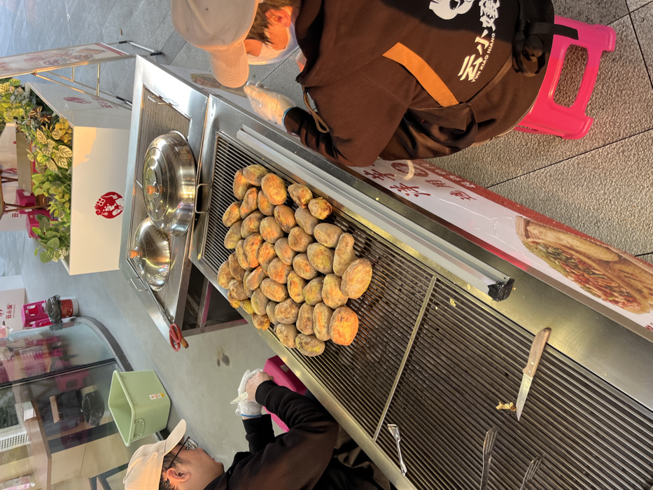 The image depicts an outdoor street food vending operation in Wenjiang District, China