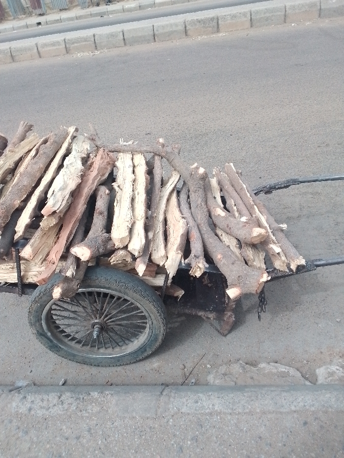 In Dabawa, Nigeria, a two-wheeled, black metal handcart is depicted stationary on an unpaved shoulder adjacent to an asphalt road. The cart is heavily laden with a substantial pile of cut firewood, consisting of numerous irregularly shaped tree branches and logs displaying varied lengths, diameters, and hues of light brown, grey, and reddish wood, many with visible rough-cut ends. A single dark, spoked wheel with a worn tire is visible on the left side of the cart. A concrete curb separates the unpaved area from the light grey asphalt road, which extends into the background, where another parallel concrete curb is visible. No individuals are present.