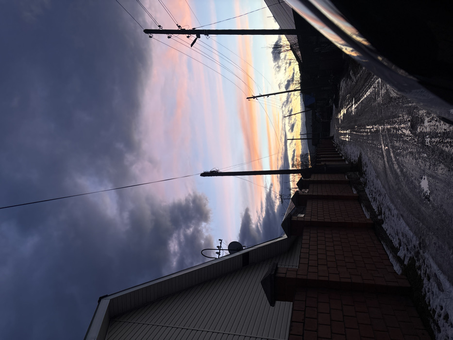 The image depicts an unpaved residential street in the city of Невон, Russia, at what appears to be either dawn or dusk. The scene is viewed from a low perspective, with a dark, reflective surface of a vehicle visible in the bottom right foreground. On the left, a two-story building with light-colored horizontal siding and a pitched roof is partially visible. Below it, a reddish-brown brick fence with dark-capped pillars extends along the road. A satellite dish and associated wiring are mounted on the side of the building. Patches of snow and ice are present on the ground along the fence. The unpaved road, running from the foreground towards the background, is wet and muddy, containing numerous puddles that reflect the sky. Tire tracks are visible in the wet surface. Several dark utility poles with multiple overhead wires line the road, primarily on the right side. The sky exhibits a dramatic gradient, with heavy, dark grey and purple clouds occupying the upper and left portions, transitioning to lighter blue, pink, and orange hues towards the horizon on the right. In the distance, silhouetted hills or mountains are visible against the colorful horizon. Another building, largely obscured by shadow, is seen further down the road on the right, with what appears to be a dark, possibly solar-paneled roof. No individuals are present in the scene.