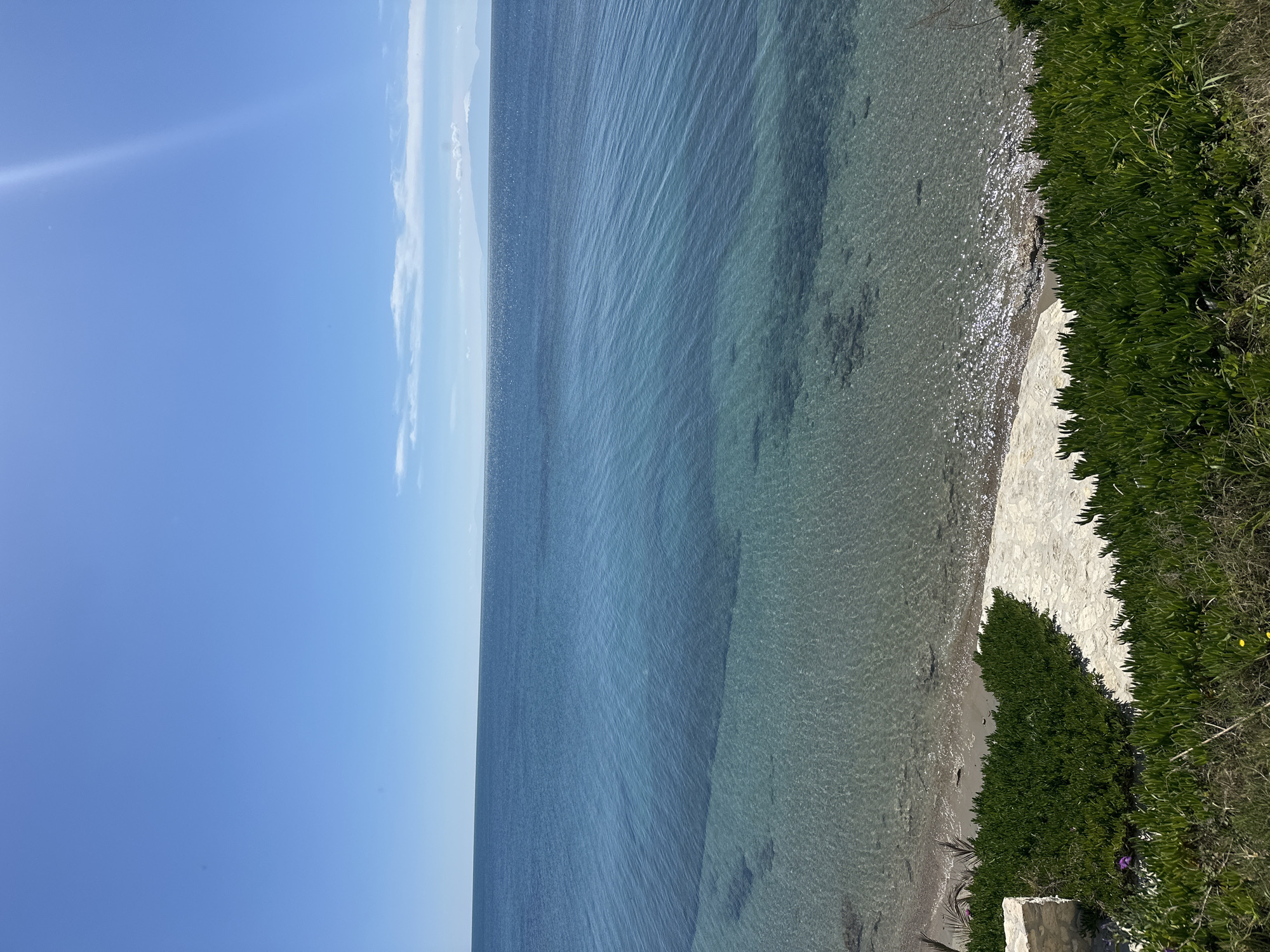 The image depicts a coastal scene in Unknown, Greece. The sky is clear blue with a few wispy clouds. The sea is calm and varies in color from deep blue in the distance to clear turquoise near the shore. The shoreline consists of a narrow sandy beach with white cliffs and lush green vegetation. No people, objects, or actions are visible. The environment is sunny and tranquil.