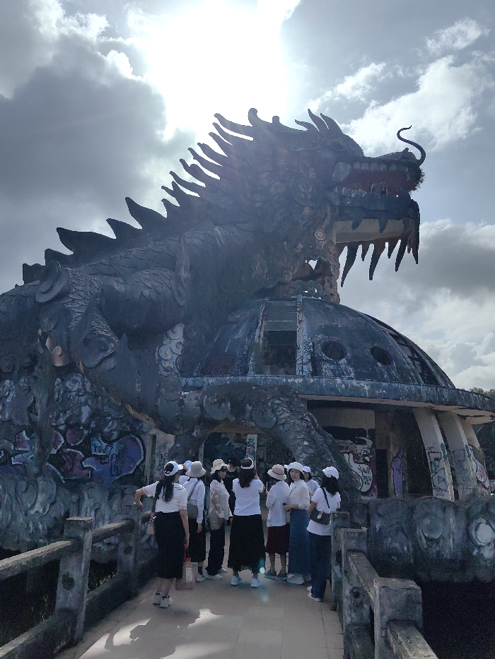The scene is set outdoors in Kim Long Ward, Vietnam, beneath a partly cloudy sky with bright sunlight. The central subject is a large, derelict concrete dragon sculpture, intricately detailed and appearing weathered, with dark, discolored surfaces and visible peeling paint. The dragon is depicted in an aggressive stance, its head turned right with an open mouth revealing teeth and a curled tongue or tendril, and its body wraps around a domed, multi-level building. This underlying structure is also in disrepair, featuring visible graffiti in various colors and broken or empty window openings. In the foreground, a group of approximately 10-12 individuals, predominantly women, stand on a concrete pathway or bridge equipped with railings. They are casually dressed, mostly in white or light-colored tops and dark bottoms, with many wearing white or light-colored hats. The individuals are positioned facing the dragon structure, appearing to observe it. Some are standing casually, while one person on the right is holding a device, possibly a phone, upwards as if taking a photograph. The strong sunlight from the upper center backlights the dragon, creating a silhouette effect and lens flare.