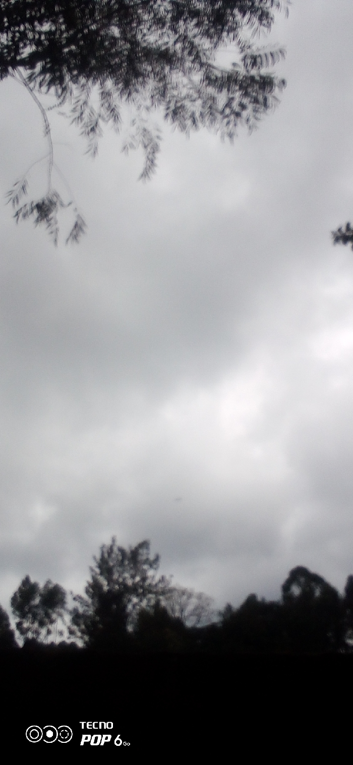 The image, captured in Mahiakalo ward, Kenya, presents a vertically oriented view dominated by an overcast, gray sky. The upper third of the frame features dark, silhouetted tree branches with visible foliage, blurred and extending from the upper left quadrant towards the center. The bottom third of the image shows a continuous dark band of indistinct, silhouetted treetops and dense foliage, suggesting a tree line or forested area. No people, specific man-made structures, or discernible actions or interactions are visible. The overall lighting is dim, consistent with heavy cloud cover. A "TECNO POP 6 Go" watermark is present in the lower left corner.
