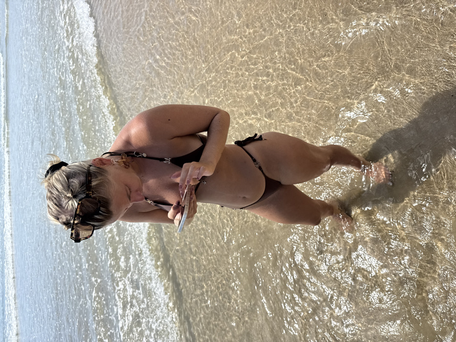 - "A blonde woman in a black bikini stands in shallow, clear ocean water, looking down at her phone" by FM-CYJaF3, licensed under CC BY 4.0
