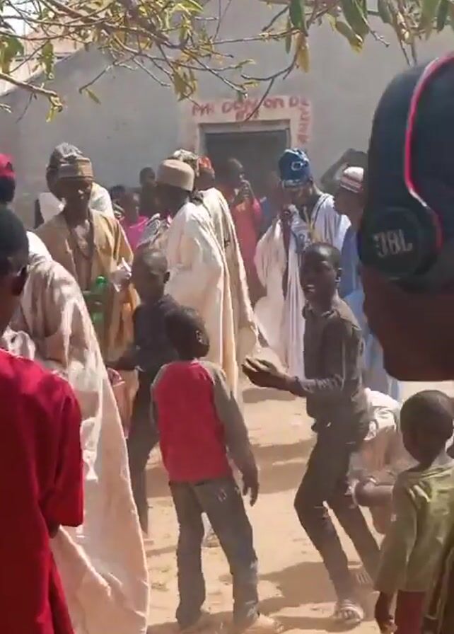 lively gathering of people in what appears to be a village setting. Adults, mostly men, are dressed in traditional clothing, including flowing robes and hats. Children are running around, seemingly excited. The ground is sandy, and there are buildings in the background, one with the words "MR DIN ON DE BIT" painted on it. A tree with sparse leaves provides some shade. There is music playing, and the atmosphere is festive.